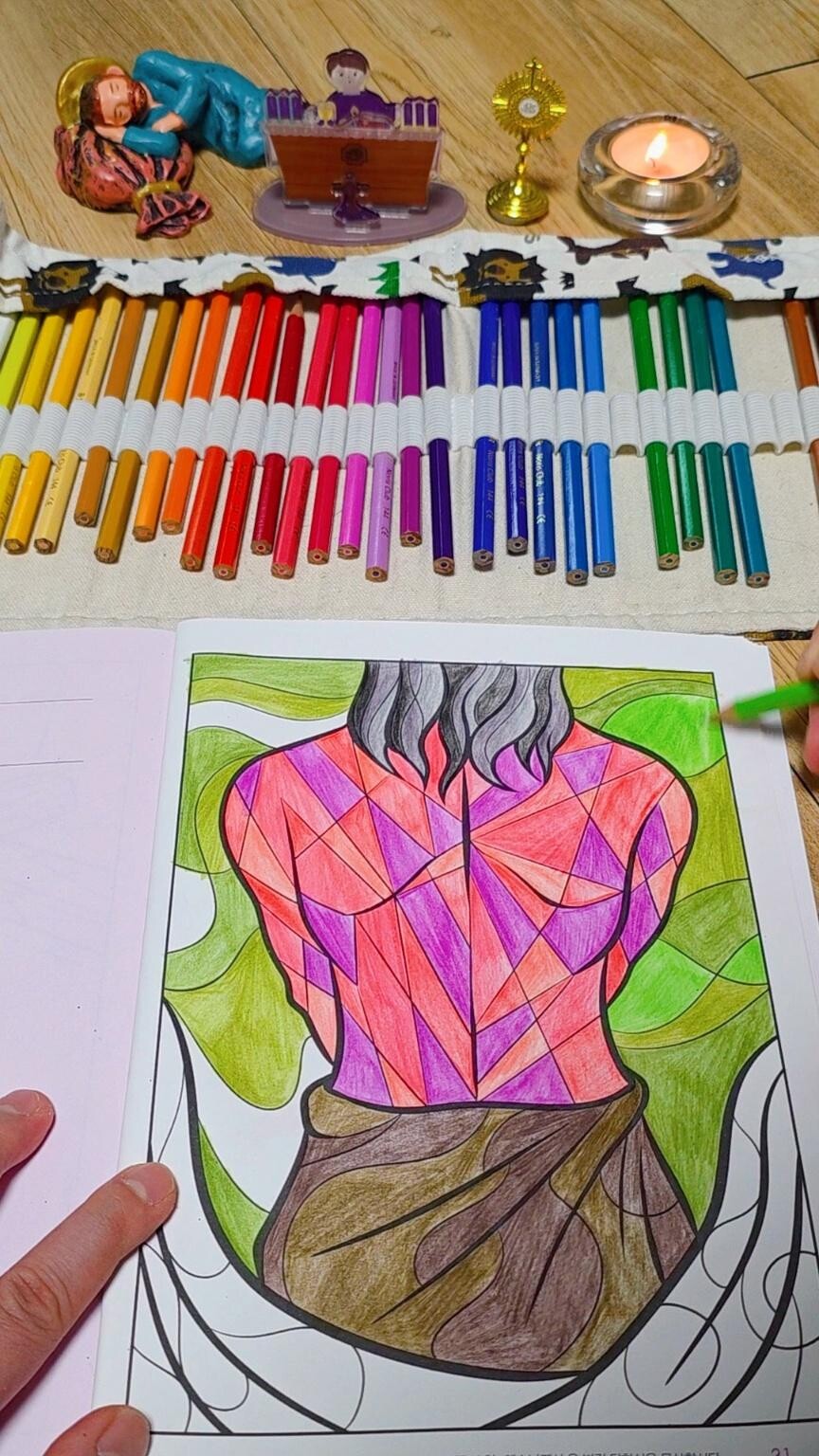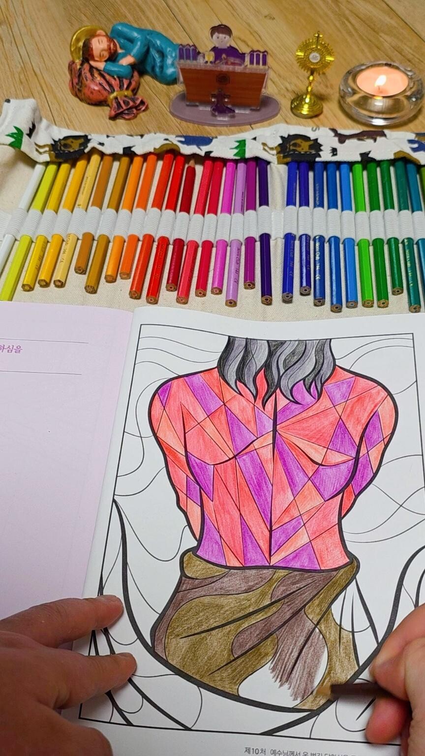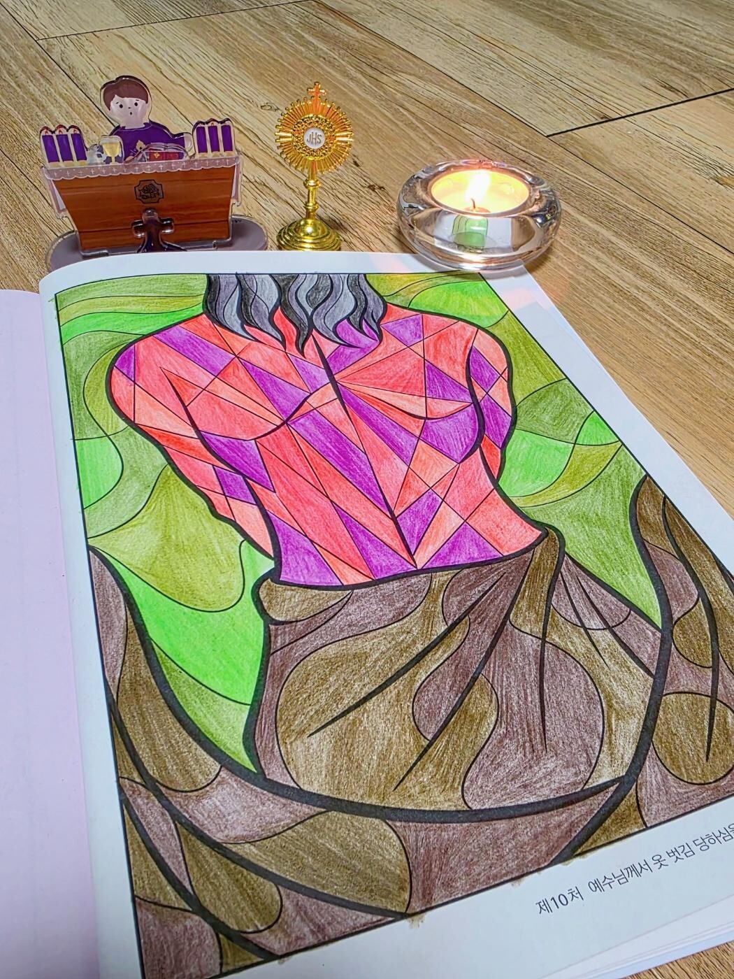 우연히 인스타로 책 나왔다는 소식을 전하고 부랴부랴 서평이벤에 당첨되어 책을 받아보게 되었네요. 똥손인 내가 할 수 있을까.... ㅠㅠ 색채이론이며, 색칠하는 방법이며, 명암대비 이런거 하나도 모르는 내가 할 수 있을까.... 하는 마음도 잠시.... 신부님의 가이드도 있고 시작기도도 바치면서 한칸 한칸 정말 묵상글을 읽어보며 색칠하는데 제 색연필의 사각사각 소리와 저만의 묵상도 함께 하며 칠하다 보니 어렵지 않았고 성당의 스테인드 글라스를 생각하며 칠하니 재미도 있었습니다. 그야말로 저만의 십자가의 길 스테인드 글라스가 되는것 같아서요 ㅎㅎ 책 되게 얇고 종이질은 최고입니다. 사진은 명암대비 따위 없는 똥손의 작품(?) 입니다 ㅎㅎ 되게 좋아요. 마니마니 사세요 ㅎㅎ 스벅 커피 두잔 포기하면 충분히 삽니다 ㅎㅎㅎ 최고!