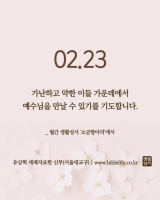 [생활성서 - 소금항아리]가난하고 약한 이들 가운데에서 예수님을 만날 수 있기를 기도합니다.⠀2026/2/23/사순 제1주간 월요일⠀마태오 복음 25장 31-46절“이 가장 작은 이들 가운데 한 사람에게 해 준 것이 바로 나에게 해 준 것이다.”⠀삶 안에서 예수님 만나기요즘 인기 있는 연애 프로그램을 보면 블라인드를 친 채 이야기를 나누며 상대방의 관심을 ...