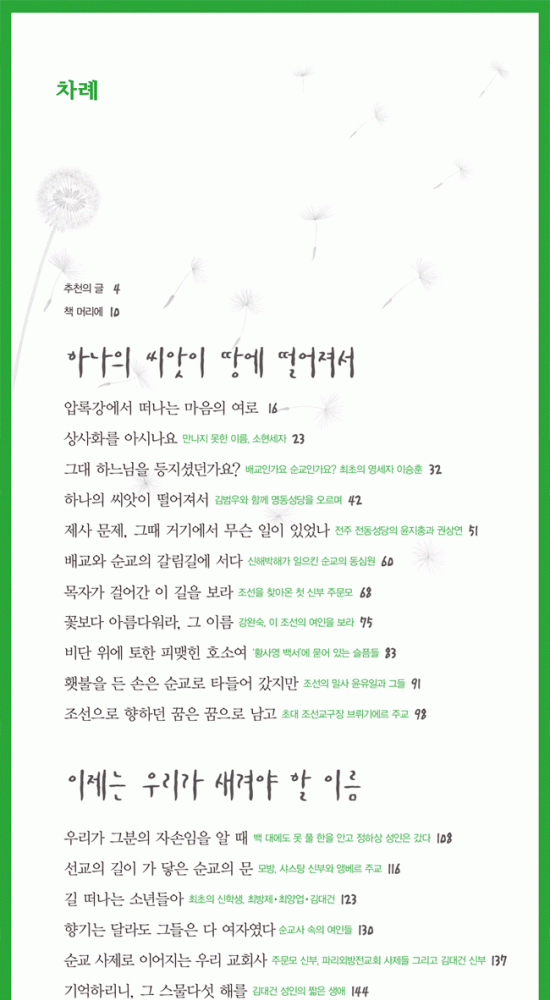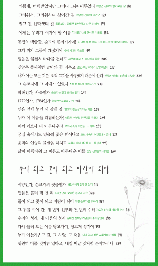 바쁜 현대인들이 하느님에 대한 신앙과 사랑을 실천하면서 산다는 것이 쉽지는 않겠지요. 하지만 성령의 도우심으로 우리 신자들이 신앙 선조들의 열정적인 신앙생활을 본받고 순교자 현양 사업에 보다 큰 관심을 가질 수 있는 계기가 되기를 희망하면서 이 책을 추천합니다.
