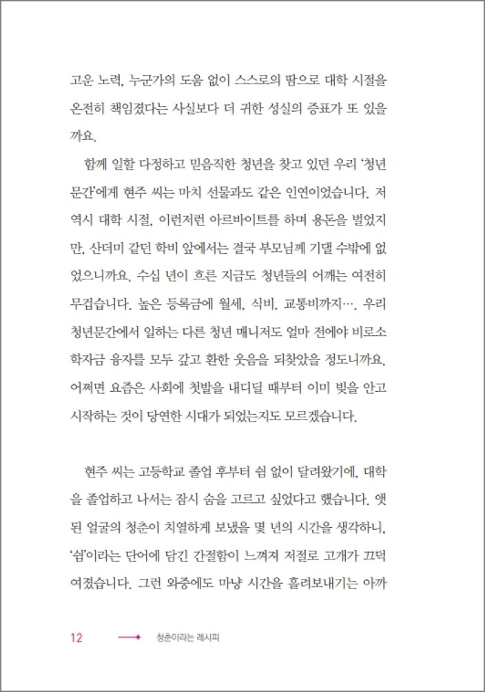 이런 마음은 주변 사람들의 고통에는 아랑곳하지 않고 자신의 이익을 더 중시하는 사회적 분위기 속에 생겨난 우리 사이사이의 깊은 골 위에 다리를 놓아 준다. 『청춘이라는 레시피』는 바로 그런 사랑의 기록이다. 갓 지은 따끈따끈한 밥처럼, 든든한 김치찌개처럼 마음을 채워 주는 위로와 응원이다.