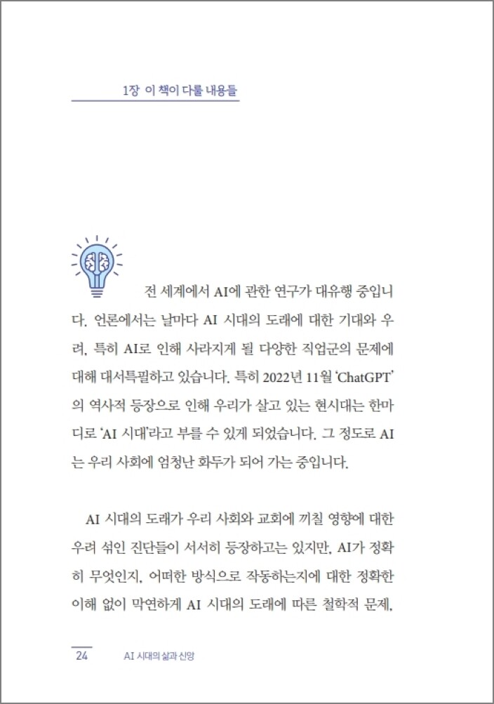 “AI 시대의 도래는 우리의 삶과 심지어는 신앙에까지도 직접적인 영향을 미칠 것으로 충분히 예상해 볼 수 있습니다. 그렇다면 우리의 삶과 신앙은 과연 어느 정도나 심각한 영향을 받게 될까요? 그리고 우리는 이러한 상황에서 과연 어떻게 살고 어떻게 믿어야 하는 것일까요?” - ‘들어가는 말’ 중에서