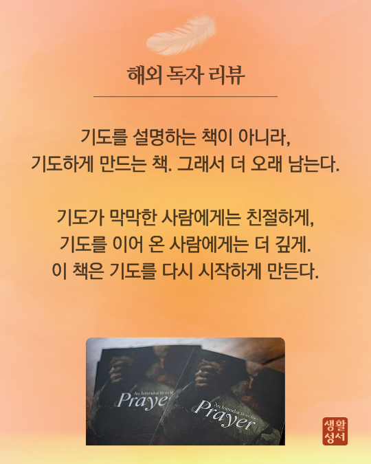 제가 이 책으로 바라는 건 단 한 가지입니다. 여러분이 기도를 배우는 것, 그리고 가장 중요한 건 바로 실제로 기도를 시작하는 것입니다. 여러분 중에 “저는 어떻게 기도하는지 모릅니다.”라고 말하는 분도 있겠지요. 좋습니다. 주님 앞에서 “주님, 저는 어떻게 기도하는지 모릅니다.”라고 말씀드려 보십시오. 그 순간에 바로 당신은 이미 기도를 시작한 것입니다. - ‘서문’에서